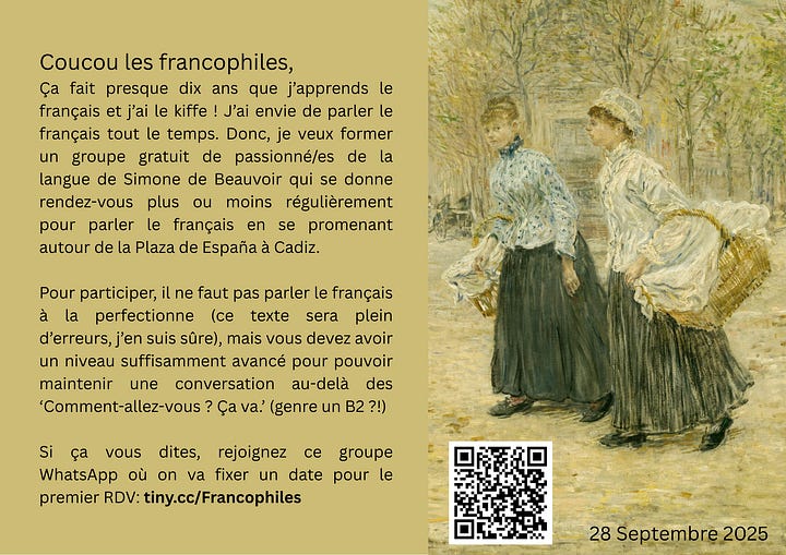 Perhaps because of this lack of imaginative language, my next steps on the friendship hunt naturally took me to the least imaginative place of all: my phone’s app store. Unsurprisingly, there are 10 times more apps to find someone to fuck than to find someone to dissect the potential one-night stand’s mirror selfie with. In the end, the mere thought of making myself some friendship profile not only made me recoil but sent me right to the opposite end of the spectrum. I went analogue everybody! Thinking back to how I made friends in my childhood, a shared interest or activity was key. The heck! How hard could it be in a town of more than 100,000 people to find someone who shared my current obsession: speaking French. And so my Francophiles Club was born. Language clubs are great for finding friends because people literally sign up to talk to each other. I actually went to the print shop for this to make real-life copies of a lovingly designed poster. Proudly, I put up my wares (I guess me, in a way?) in local bookshops and cutsie cafes in my neighbourhood inviting fellow French lovers to meet me for French Walks & Talks at Cádiz’ Plaza de España.